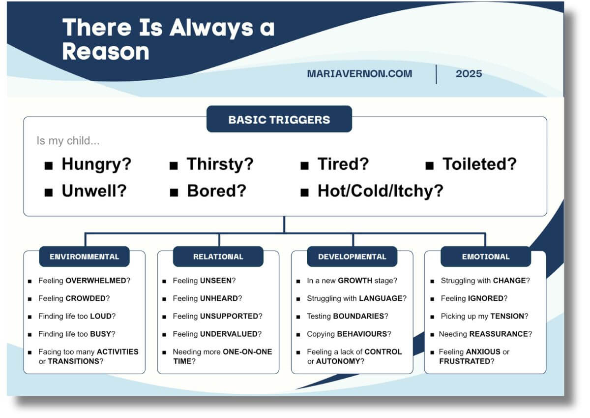 To help you remember to decode the clues your child is giving you, I’ve created this simple, one-page checklist. Think of it as your go-to guide to help you pause, take a breath, and quickly consider the “why” behind your child’s actions. It reminds you to check all the key triggers—from basic physical needs like hunger and tiredness, to deeper environmental, relational, developmental and emotional needs.
